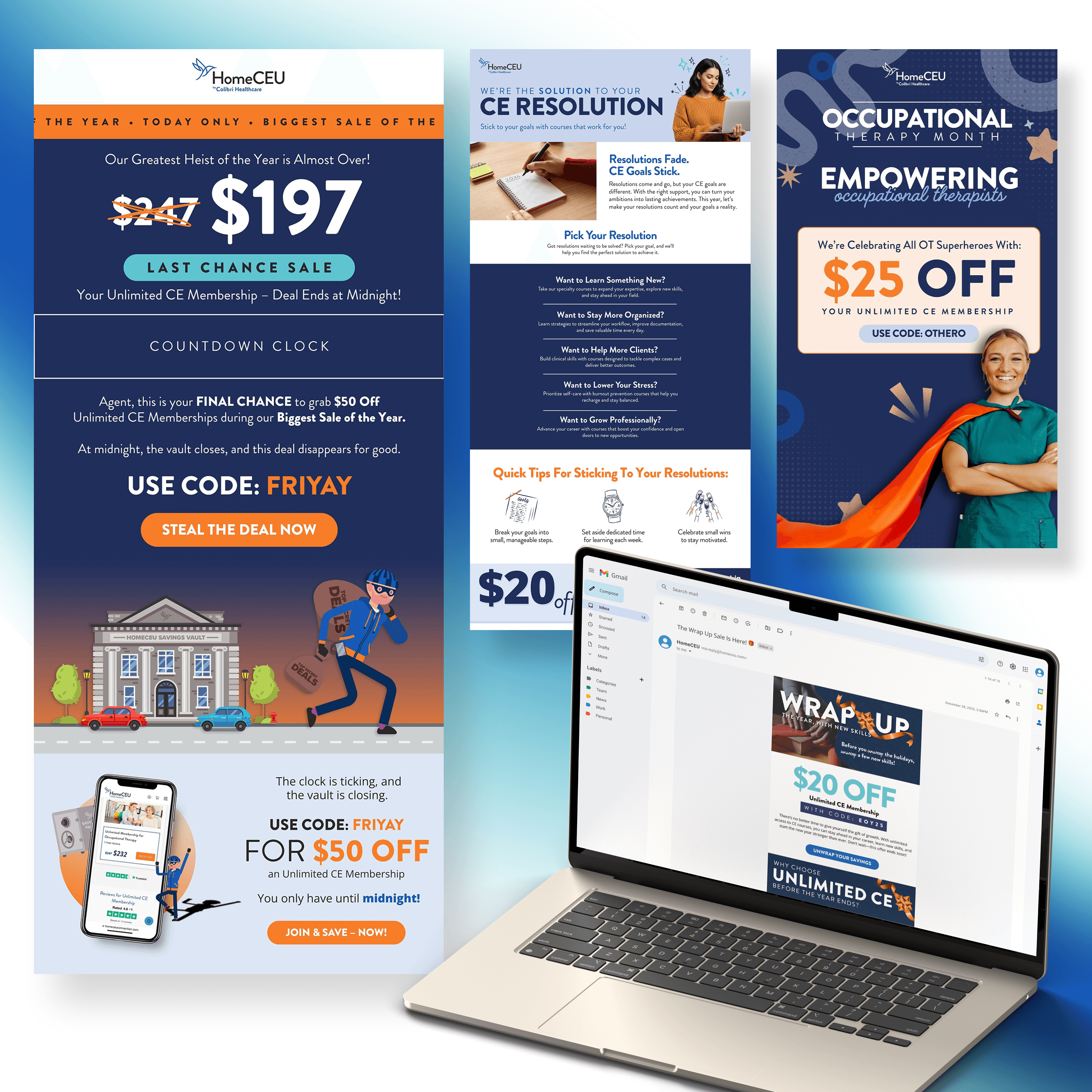 I design and optimize email campaigns for HomeCEU and Elite Learning, refining layouts, visual systems, and messaging strategies to improve performance. By continuously testing creative approaches and evolving our templates, I help increase open rates, click-through rates, and overall campaign effectiveness while maintaining strong brand alignment.