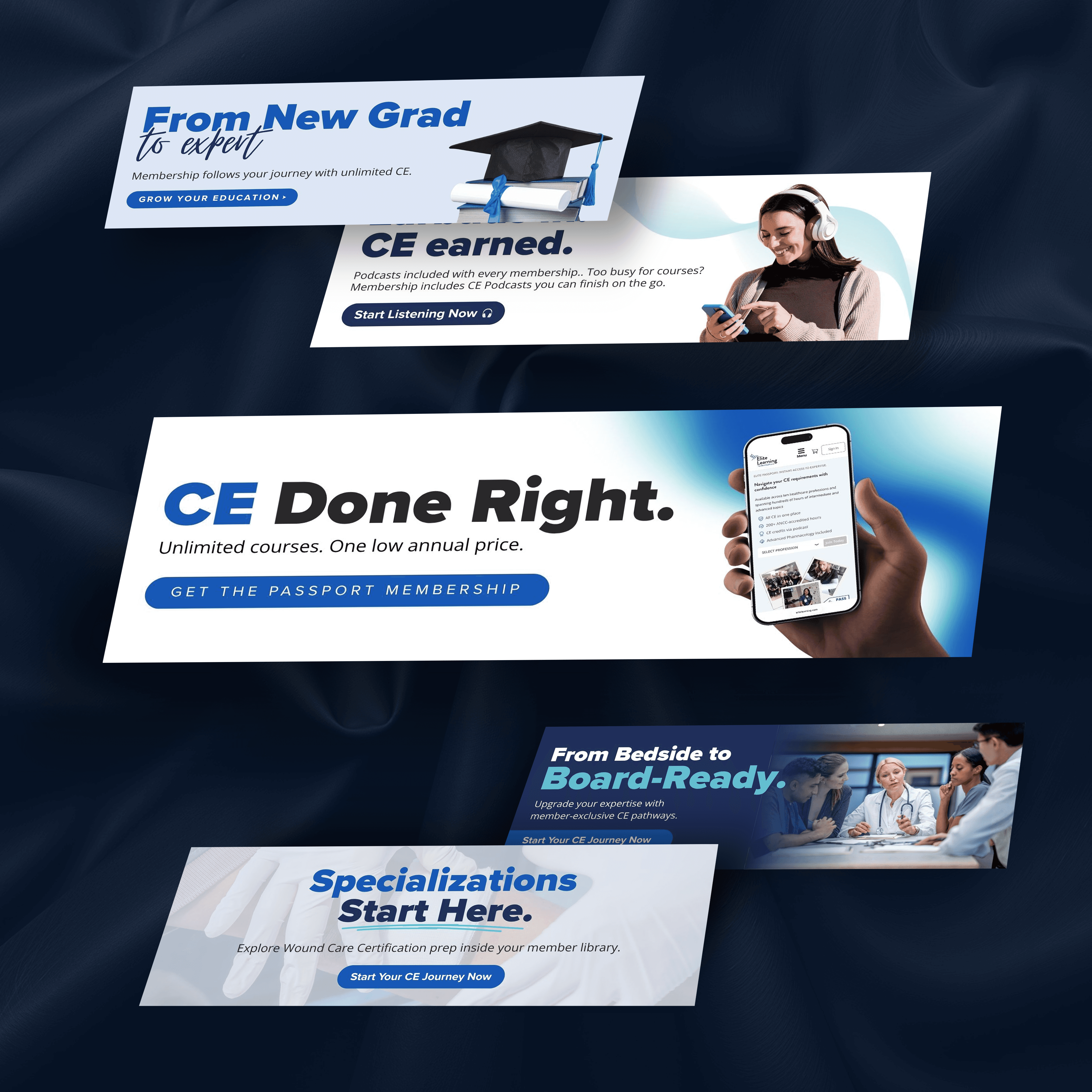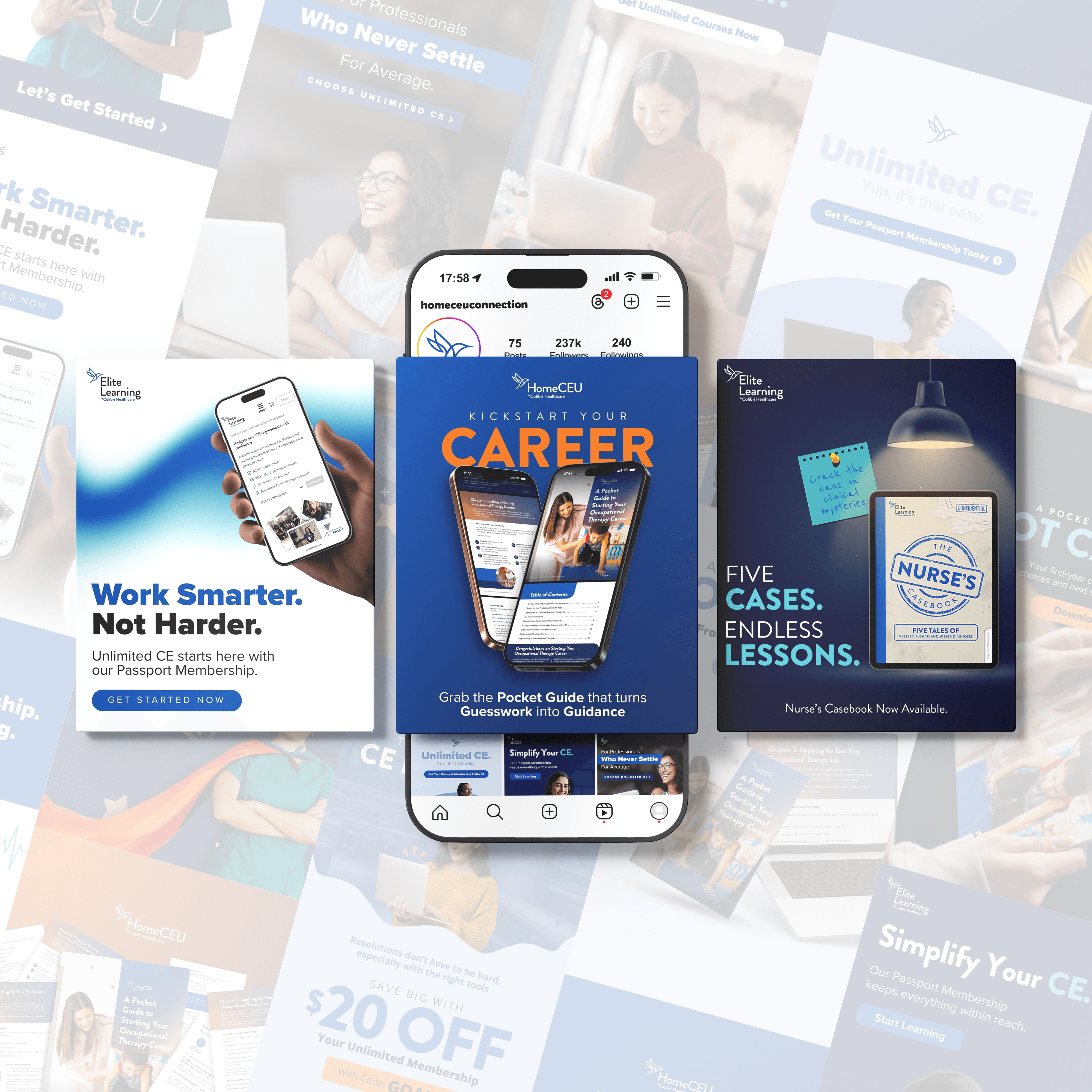 On the social side, I create both paid and organic content for HomeCEU, Elite Learning, and NetCE. Each piece is designed with intention, balancing scroll-stopping visuals with clear messaging to drive awareness, engagement, and conversions. From campaign concepts to execution, I focus on creating content that resonates with each audience while staying cohesive across brands.
